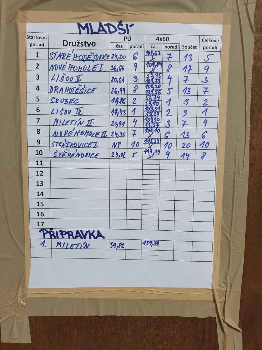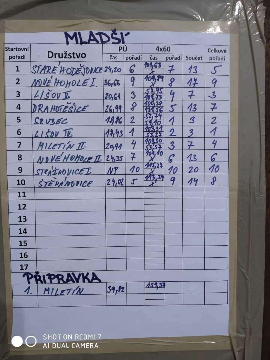 Soutěžilo se v požárním útoku a štafetě 4×60. Na startu se sešlo v kategorii starších žáků 13 soutěžních družstev a v kategorii mladších žáků 10 družstev. Naše družstvo starších žáků zaběhlo PÚ v čase 21,25 a štafetu v čase 54,01. V konečném součtu se tak umístilo na 11. místě. V kategorii mladších žáků družstvo Nové Homole I. dokončilo PÚ v čase 36,66 a štafetu v čase 109,89. V celkovém hodnocení tak skončili na 9. místě. Družstvu Nové Homole II. se dařilo lépe a s časy 24,35 v PÚ a 101,10 ve štafetě obsadili v konečném hodnocení 6. místo.